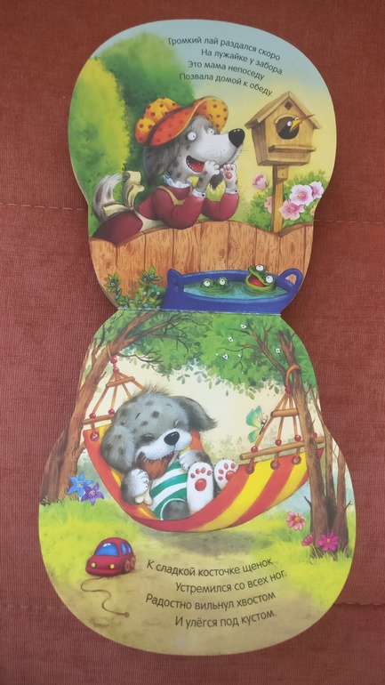 Щенок только не очень приглянулся, потому что всю книжку он голодный и грустный - звери наперебой предлагают ему свою еду...но в конце мамочка,конечно,его спасает. И малыш счастливо грызёт свою косточку.
