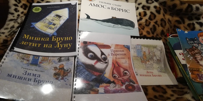 "Мишка Бруно летит на Луну" и " Лето мишки Бруно" - летние книги, где есть и пикник, и дождик, и друзья, и приключение, и малиновый торт) Мишка Бруно - наш герой этого года. Читаем постоянно все книги про него. Они такие незамысловатые, но чем то привлекают детей, может быть как раз обыденностью жизни Бруно, кажется ничего особенного с ним не происходит, но настолько все мило. Когда мы топим камин на даче, то все время вспоминаем "Зиму мишки Бруно" и его камин)