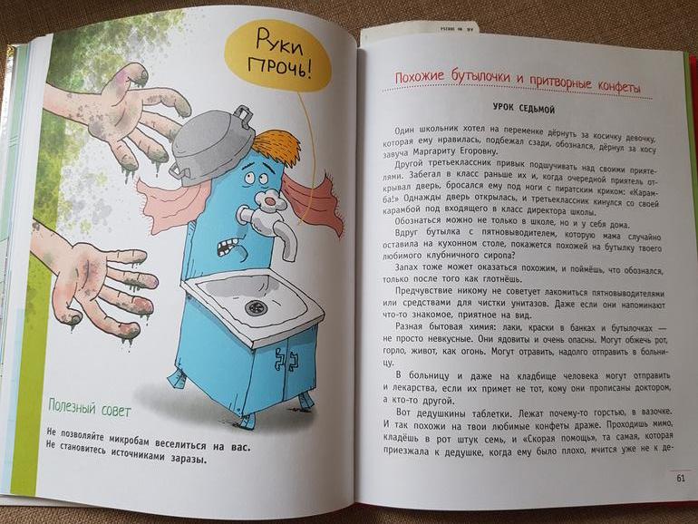 С этим творческим тандемом дочка знакома по Вредным советам - любимая книга этой зимы. Здесь тоже много шуток, но главное - важная информация о технике безопасности. Книга разбита на уроки, каждый урок на определенную тему - какая опасность существует и как её предупредить: