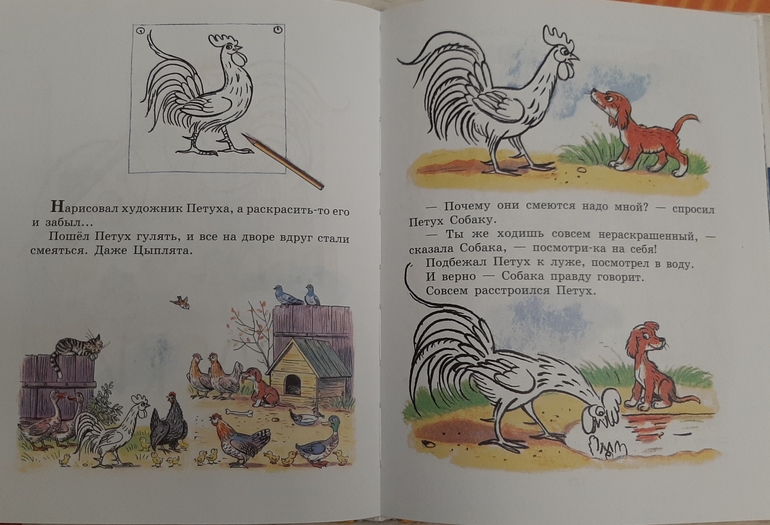 Сутеев совершенно точно входит в обязательный список книг для детей. А как чудесны мультики с его рисунками! Вот искренне не понимаю тех, кто считает их старыми советскими мультиками и необязательными к просмотру.. Мой никогда не откажется пересмотреть Мешок яблок, который знает наизусть, и постоянно к месту цитирует) или же кота- рыболова или Петуха с красками)