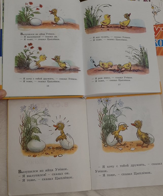 И она не избежала участи быть залюбленой!) Эта тоненькая книга входила в пятерку первых самых любимых книг у сына! Очень хорошо помню, как выдавала Полинке стопку Болтали две сороки с рисунками Васнецова, Зоопарк Ван Флита, Гусеницу Эрика Карла, большую книгу про цвета от клевера и эту тоненькую, и 20 мин свободного времени было обеспечено, старшая читала младшему)