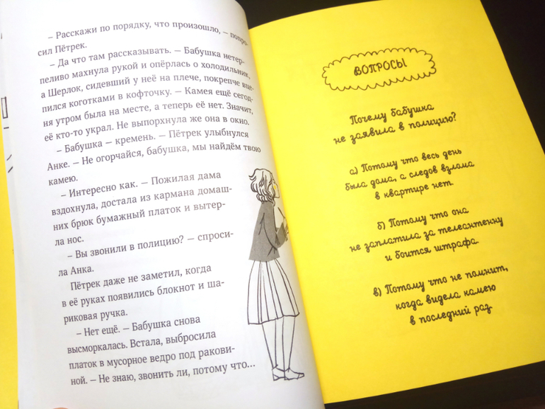 Книга состоит из небольших глав и к концу каждой главы рассуждения и поиски приводят к новому вопросу и на одной странице даются три возможных варианта ответа - читатель может сначала сам потренироваться в рассуждениях и выбрать свой ответ. Ну а, начав следующую главу, получить правильный ответ. То есть автор книги дает возможность учиться расследовать своему маленькому читателю, наводя сомнения то на одного, то на другого подозреваемого. Ближе к концу книги я догадалась, что произошло с камеей. Мой сын, конечно, же не догадался - и возраст маловат, и опыта в детективах маловато.