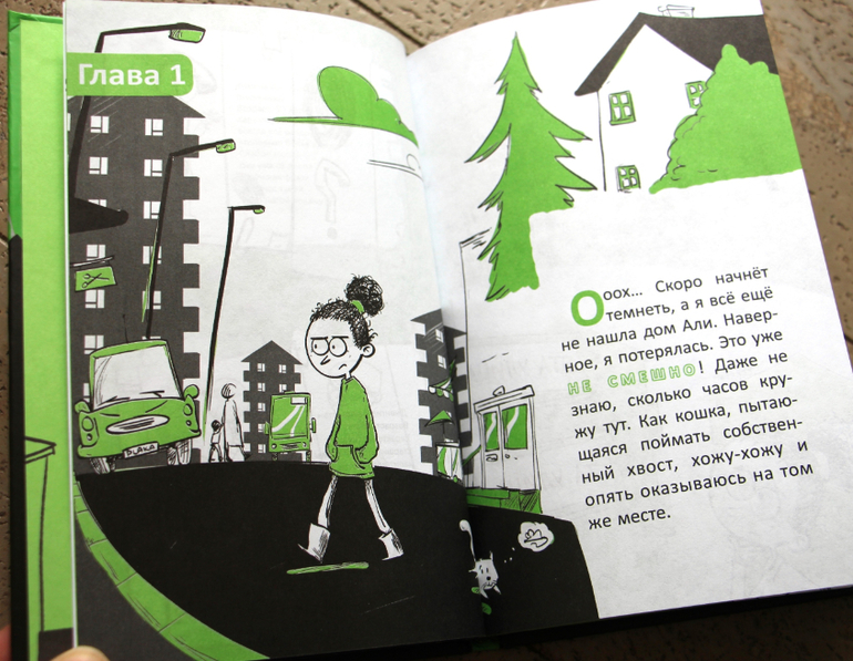 Книга больше по размеру предыдущих и гораздо толще по содержанию - осилит уже хорошо читающий школьник. Иллюстрации черно-бело-зеленые. Забавно, но я только сейчас обратила внимание, что в двух предыдущих книгах иллюстрации тоже в три цвета выполнены.