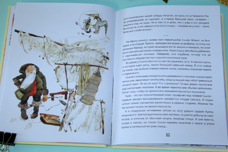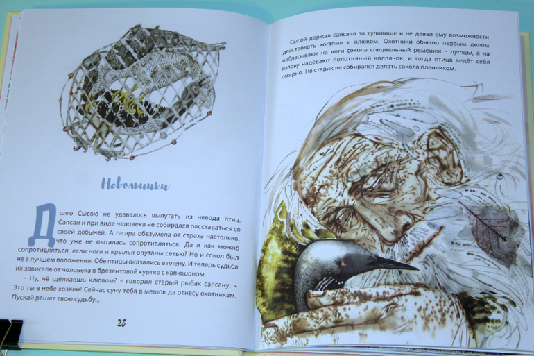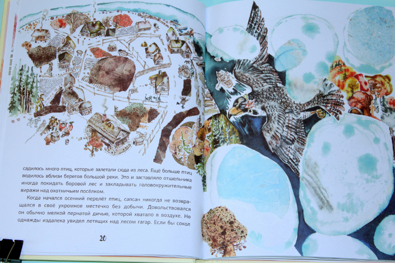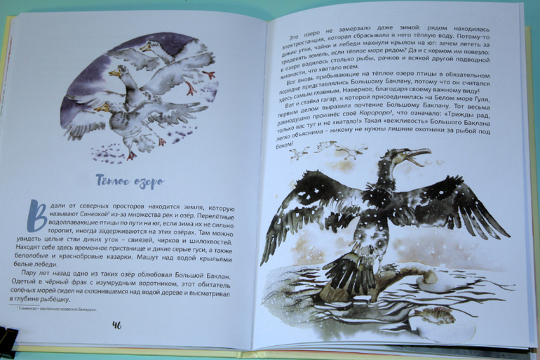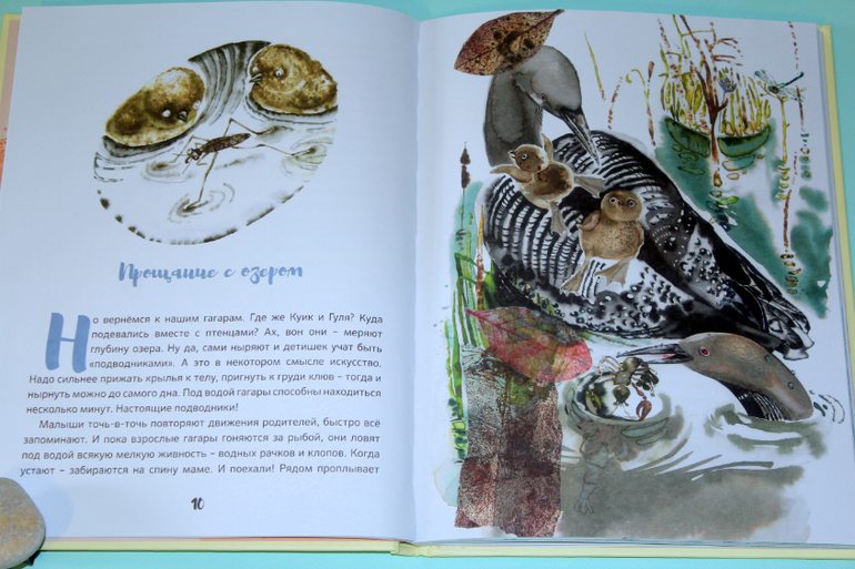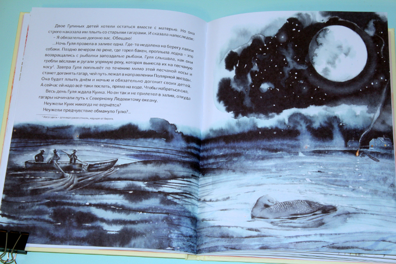 Но вернемся содержанию. Семья гагар, мама Гуля и муж её Куик. Нежная любовь родителей, умные и покладистые детки. Семья сапсана. Ворчливая, недовольная жена, наглые, избалованные дети. Когда с сапсаном случилась беда, на охоте он потерял глаз, то понял, что своей семье он больше не нужен и стал жить один. Однажды он напал на стаю гагар. Куик спас всю стаю, отвлек внимание сапсана на себя. Жена отказалась продолжать пусть на юг, она отправила детей, а сама осталась на озере ждать мужа. Ждала и надеялась, верила и верила, что он жив. Но он не прилетел. Гуля уплыла. Но весной, возвращаясь в родные края, она трепетала в надежде о встрече, она продолжала верить. Вот ведь какие разные семьи бывают у птиц, все как у людей!))