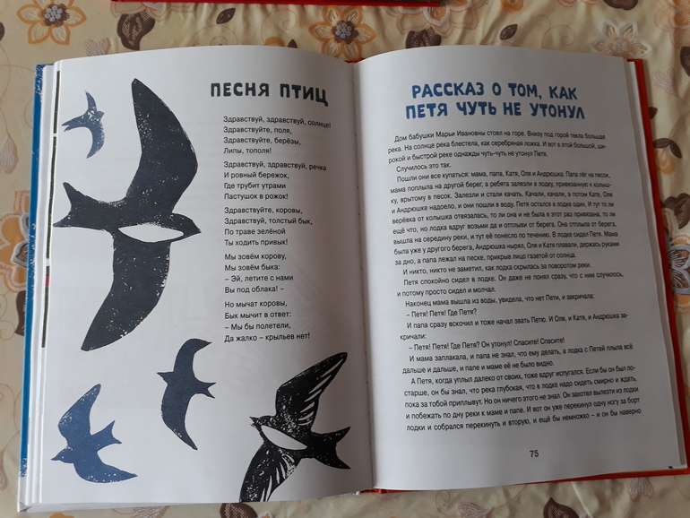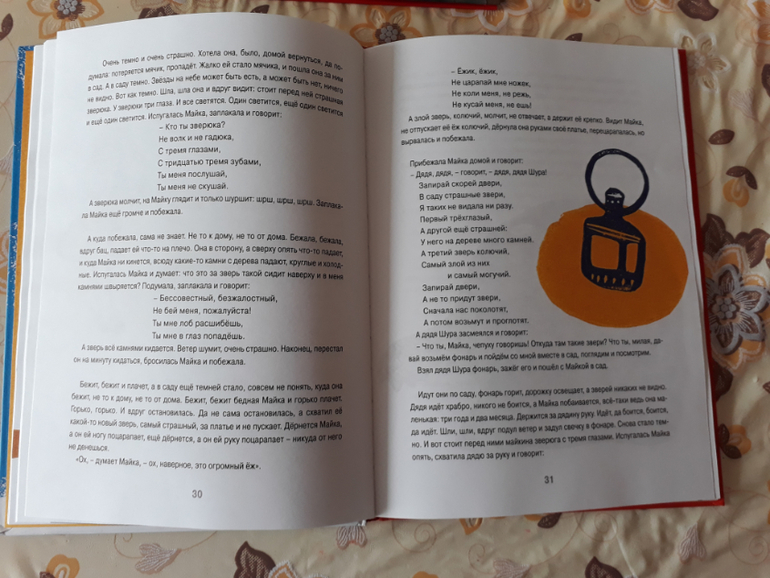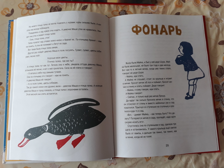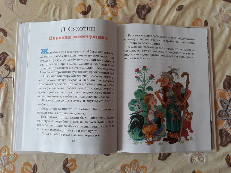 Вообще хочу немного рассказать о том, как Оля выбрала ее к чтению. Эта книга была меной куплена и отложена в закрома. Так как мне показалось, что сказки эти на более старший возраст и мой девочке будут еще сложноваты. Сумка с закромами книг находится у нас в кладовке, стоит на видном месте, Оля особого интереса к ней не проявляет, хотя знает, что там книги. При этом Оля иногда любит поиграть в «школу», так вот «школа» как раз и находится в кладовке. Однажды дочь ушла в «школу» и вернулась с книгой, открыла на первой странице, указала на картинку и сказала: Читай про это.