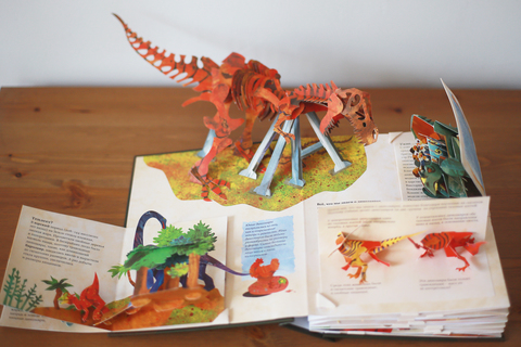 УХ! Прямо из центра книжки поднимается большая, яркая объемная картинка - динозавр. Рядом несколько предложений текста, а по углам - небольшие, тоже объемные, картинки с занимательными фактами об этом причудливом существе. В книге с картинками очень важно, чтобы изображение и текст поддерживали и взаимно обогащали друг друга. Авторы книжки с блеском справились с этой задачей. Они собрали самые последние сведения и самые яркие, красочные факты об удивительных животных, когда-то населявших нашу планету. В книге описаны пятьдесят с лишним видов динозавров, а в конце изложены гипотезы о причинах их исчезновения. Все продумано и сделано для того, чтобы книга получилась прочной. Никаких вставных-выдвижных элементов, норовящих выпасть и затеряться. Даже неугомонным юным исследователям будет нелегко истрепать «Динозавров». Недаром о них с восторгом отзываются библиотекари - а уж они-то знают, о чём говорят! У книги есть лишь один недостаток: открывает её ребёнок и каждые пять минут: «Мама, мама! Смотри, какой раптор!», «Папа, папа, скорее! Вот это зубы - как сабли! Видишь?» И так десять раз подряд. Впрочем, мы не против, если у всех наших книжек будет такой недостаток.