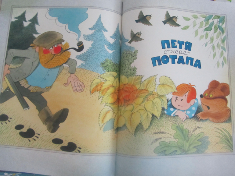 Не забывает сынок про любимого Потапа и вроде выросли мы уже из этой книги, там же текста раз-два и всё.. )), но с периодичность раз в месяц сын приносит читать, я в своё время долго тянула с покупкой этой книги, так как она она была у нас в местной библиотеке ( другого издательства), но довольна потрёпанная, я дочке несколько раз её брала, она была в восторге. И зачем я так долго тянула с покупкой, книга стала хитом! Издание великолепное, большой формат, яркие чёткие иллюстрации на каждой странице, книга-картинка по сути. И для самостоятельного чтения дочки подходит, пару раз уже читала брату сама )) Самая любимая история из трёх конечно про злого охотника )) Какие всё-таки классные мишки у Чижикова получаются