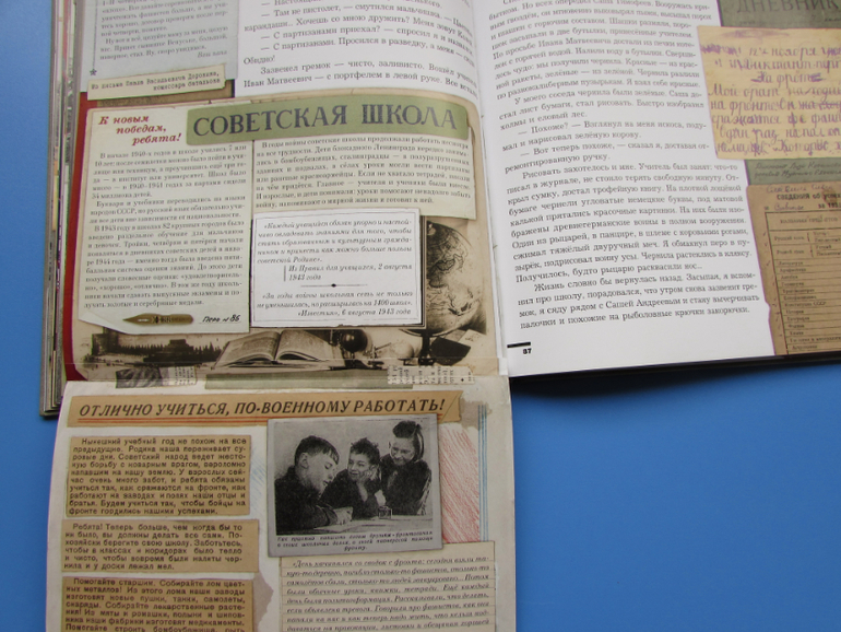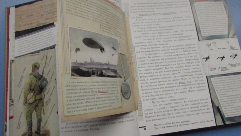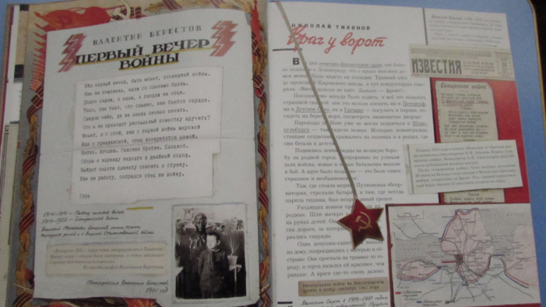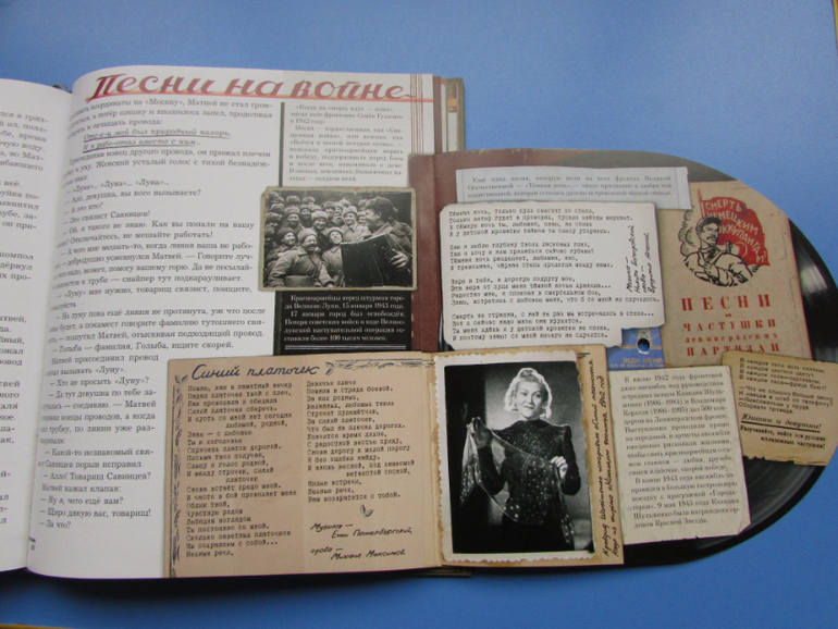 Фронтовые письма, сводки Совинформбюро, вырезки из газет, инструкции для красноармейцев, плакаты, фотографии и документы из семейных архивов, фрагменты воспоминаний и дневников и пр.