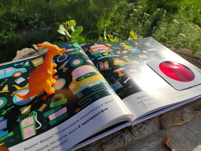 Ведь лежащая перед нами интерактивная книга с полчищами динозавров на страницах - это вовсе не художественное произведение, а учебное пособие, отличный тренажер для отработки и закрепления многих навыков: счета, чтения, концентрации внимания, усидчивости и терпения, выработки определенных алгоритмов поиска и просмотра материала. А внешне-то вроде бы сплошное баловство, обыкновенный виммельбух с обычными заданиями.
