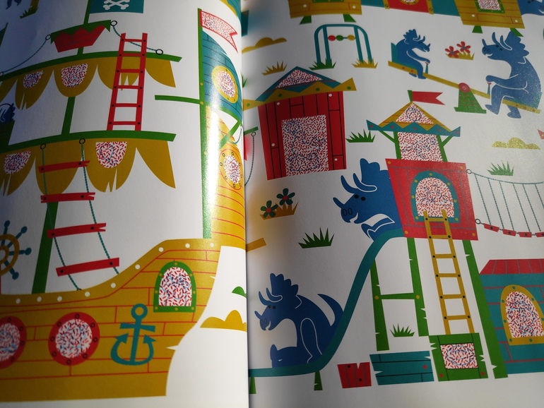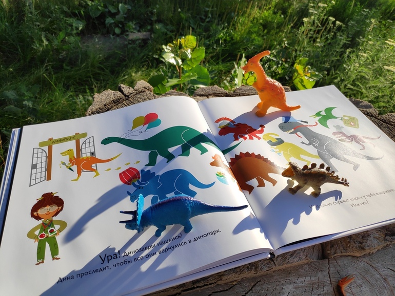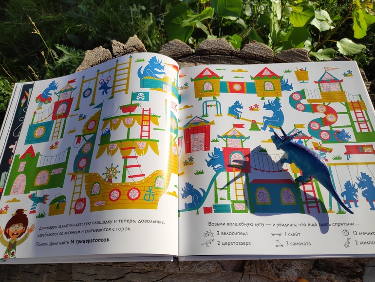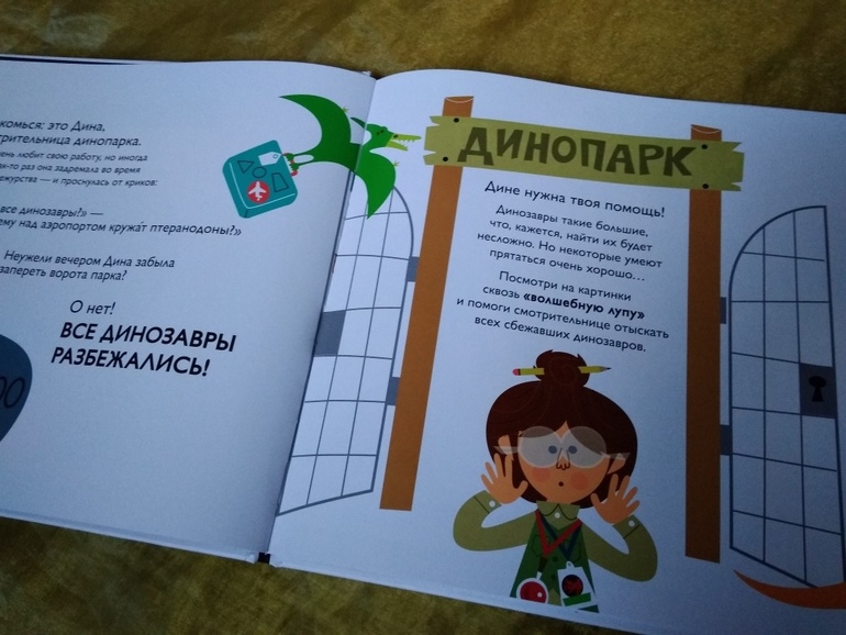 И теперь на остальных страницах нужно найти удравших обитателей динопарка, которые разбрелись по всему городу и оказываются в самых неподобающих и неожиданных местах.