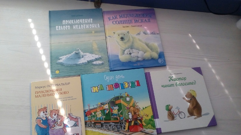 Как медвежонок солнце искал - Максиму эта книга очень нравилась, мы ее прямо часто читали. ДУмаю, его больше всего в книге привлекало то, что там есть мама. Я купила ему подобную Приключение белого медвежонка, но эта книга Макса вообще не заинтересовала. Как Кастор чинил велочипед - тоже оставила равнодушным нашего читателя. Один день на поезде - купили буквально на днях, эта книга Максима заинтересовала, прямо с интересом прослушал, посмотрел и попросил прочитать еще раз, но это для него оказалось слишком, и мы не дочитали. Неплохая книжечка, цена конечно высокая. Если найду по адекватной цене, куплю еще про пожарных из этой серии.
