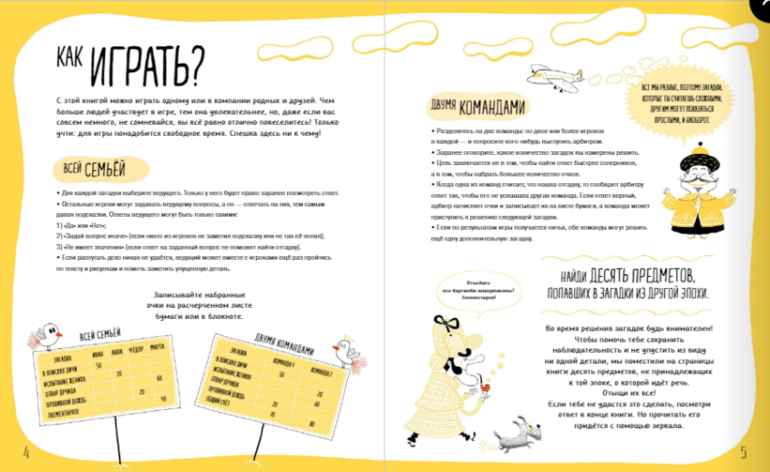 Помимо основных заданий ребенку предлагается найти в книге 10 картинок, изображающих предметы, не соответствующие эпохе, о которой идет речь в тексте, т.е. 10 анахронизмов. В конце книги приводится список ответов, а также список анахронизмов.