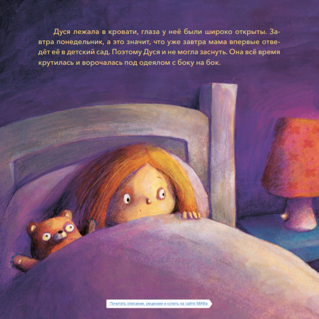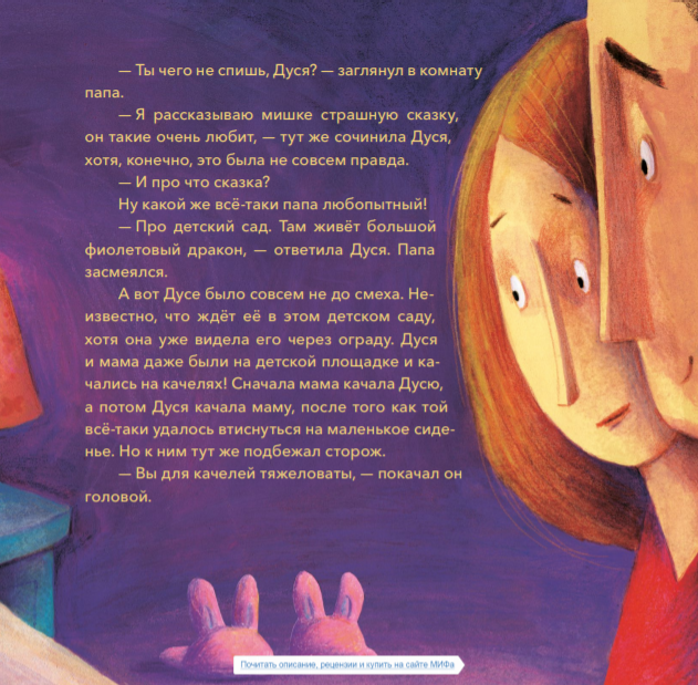 Совсем скоро Дуся впервые пойдёт в детский сад. Девочка очень волнуется. Что же её там ждёт? Подружится ли она с кем-нибудь? А вдруг в детском саду живёт большой фиолетовый дракон?