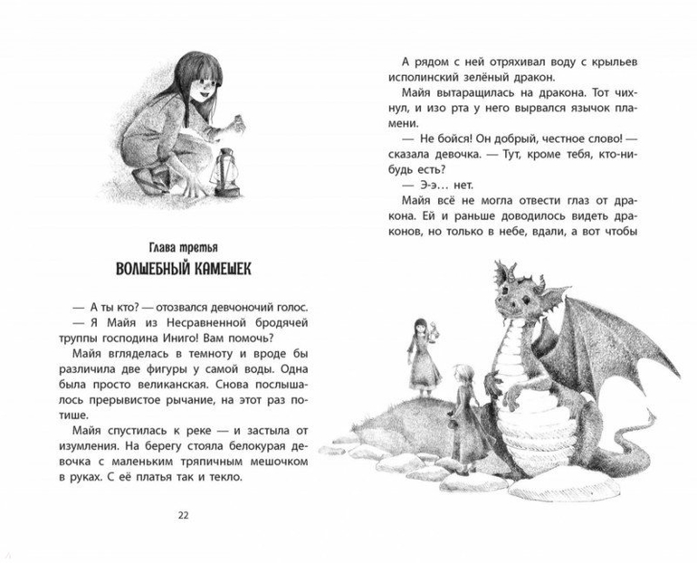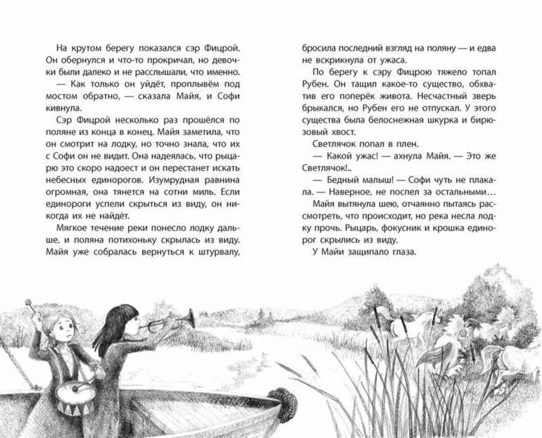 "Небесные единороги медленно спускались по холму к реке, к самой Майиной лодке. Вперёд табуна, весело размахивая бирюзовым хвостиком, выскочил крошечный жеребёнок. Он нагнул голову, чтобы попить речной воды. От волнения у Майи захватило дух. Она ещё никогда не видела маленьких единорогов. Ножки у жеребёнка были тоненькие, а шёрстка такая белая, что прямо светилась".