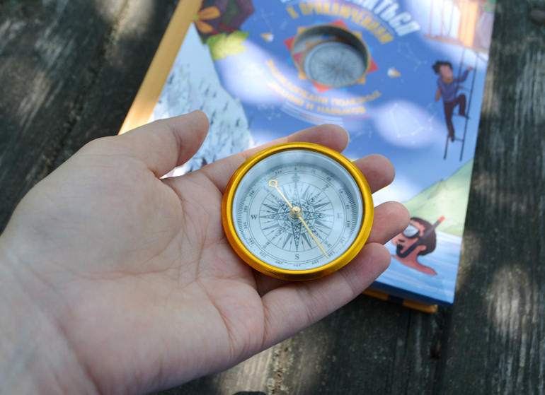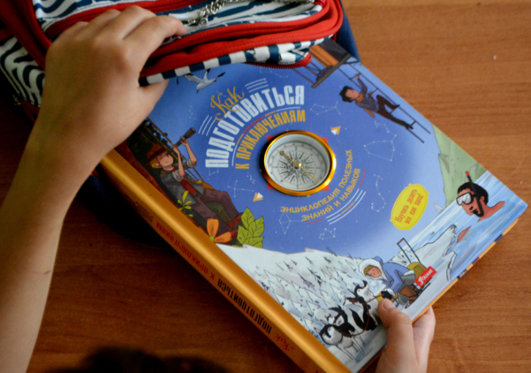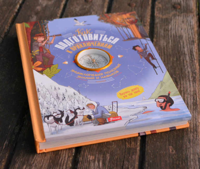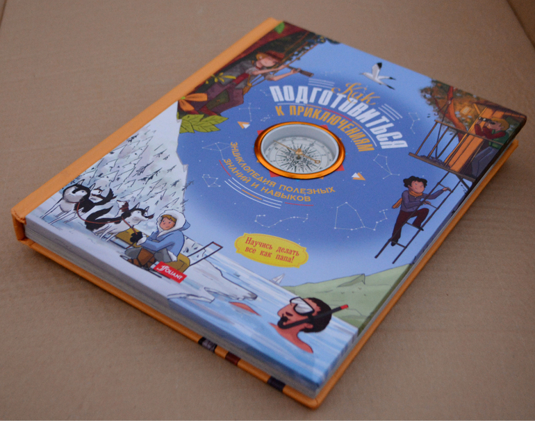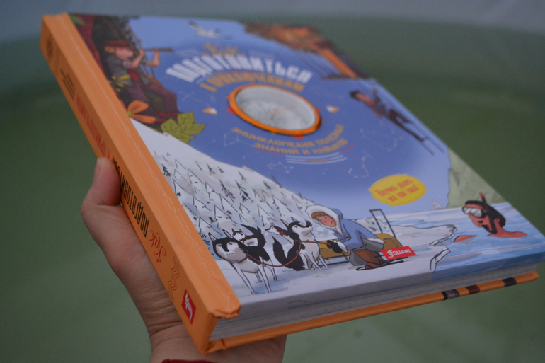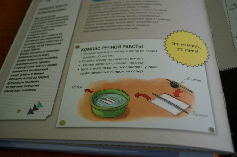 В обложку встроен компас, который можно вытащить, но он больше декоративный нежели функциональный, хотя смотрится здорово и очень необычно, сразу выделяет книгу среди других энциклопедий для мальчиков .