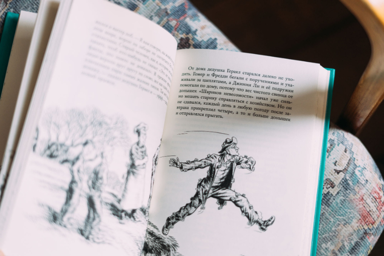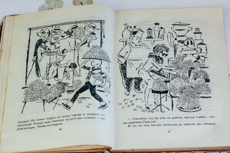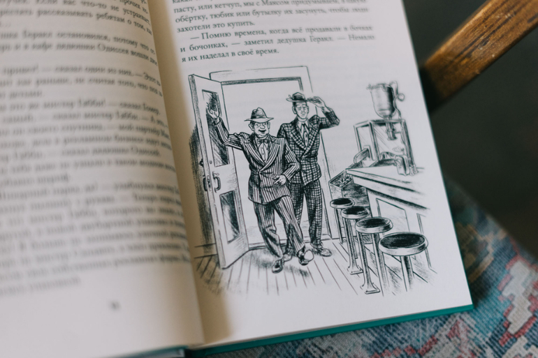 Книжка про Гомера Прайса устоит. И хотя я по-прежнему отдаю предпочтение рисункам Медведева, уверена, Макклоски тоже признал бы, что наши Шериф и дядюшка Одиссей лучше передают созданные на словах образы. Рисунки автора тоже классные! К тому же всегда хотела узнать как выглядит тот странный посетитель кафе, который принёс Пластинку.