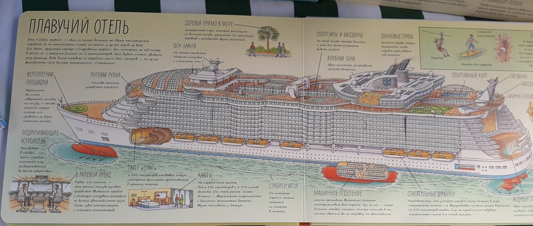 так как на даче ему иногда читают другие дети, дочка или племянница, то девчонки тоже теперь в курсе, как перевозят самосвал с места на место, сколько литров помещается в его топливный бак и зачем отражающие полосы полицейским машинам) мне в этих книгах нравятся, что информация подана не в виде сухих фактов, а достаточно образно. Например, что в самосвал вмещается 1200 роялей или 70 слонов, а один из 6 двигателей громадного корабля Оазис морей сжигает столько же топлива, как 86 автомобилей!