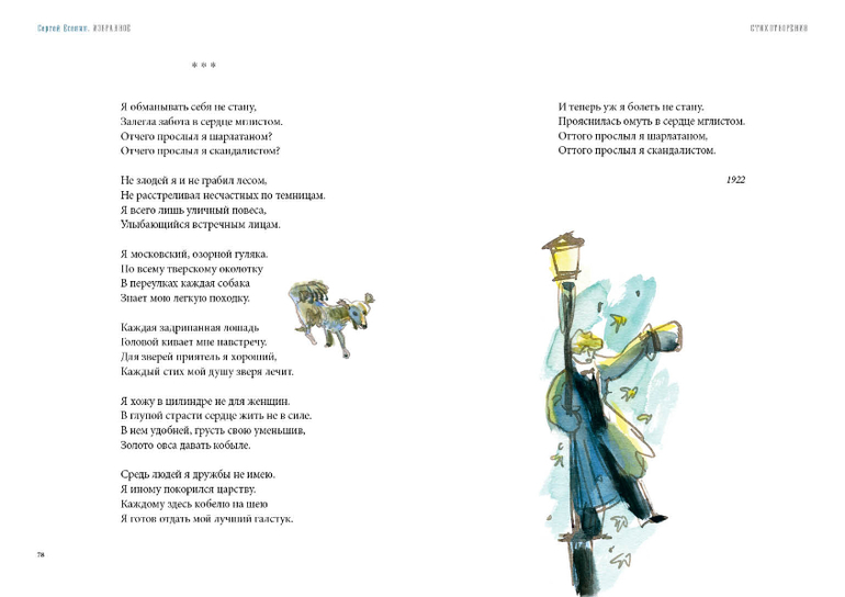 выходит сборник произведений Сергея Есенина, в который войдут самые знаковые стихотворения, поэмы «Пугачев», «Страна негодяев», «Песнь о великом походе», «Поэма о 36», «Анна Снегина», «Черный человек» и четыре версии автобиографии поэта.