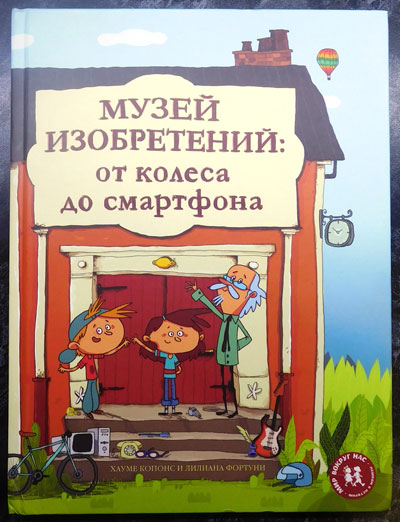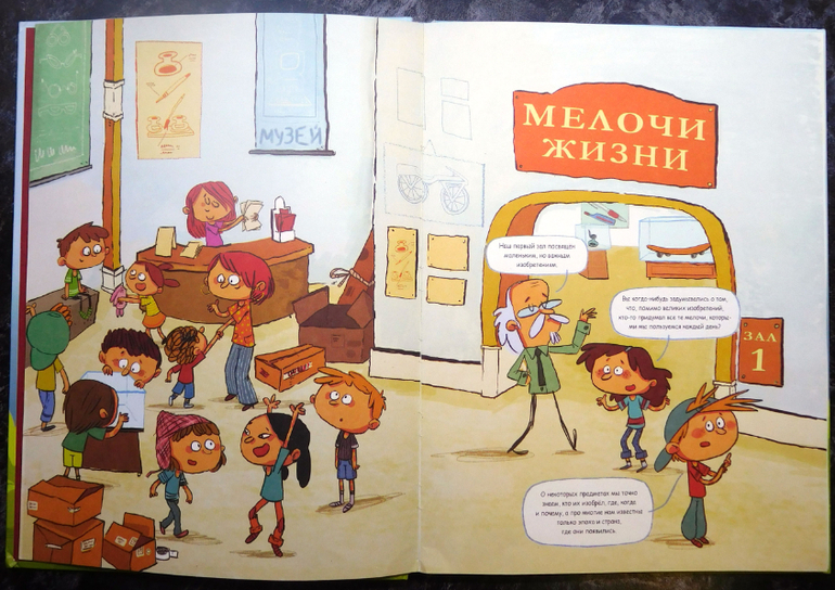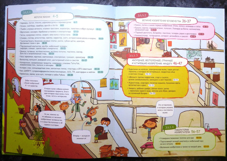 Книга большая, красочная, основательная (плотные страницы, прошивка, крепкая обложка). Открыв её, мы переносимся в музей изобретений, чтобы вместе с тремя вспомогательными персонажами (директором музея и двумя детьми-посетителям) пройти через четыре выставочных зала и познакомиться с историей разнообразных вещей.
