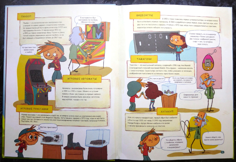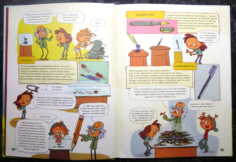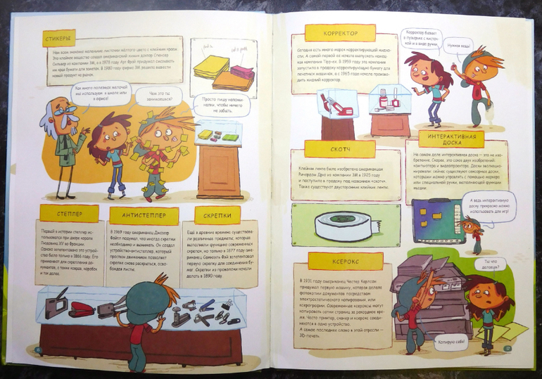 Как я уже сказала, по страницам этой энциклопедии изобретений нас ведут три персонажа: директор музея и два ребенка - мальчик и девочка. Но ни я, ни мои сыновья так и не нашли ни имен этих героев, ни их возраста. Жаль. Мне бы хотелось, чтобы эти персонажи были хоть как-то представлены в книге, все же они пройдут вместе с читателем от "корки до корки".