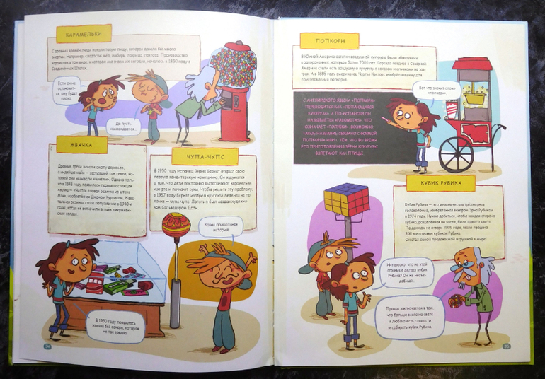 Книгу рекомендую для самостоятельного чтения младшим школьникам. Это, конечно, не полноценная энциклопедия вещей и изобретений (но книга и не обещала быть таковой!), а сборник фактов, которые, тем не менее, действительно познавательны и интересны. И мне кажется, что эти короткие статьи об истории знакомых нам вещей способны заинтересовать не только ребенка, но и взрослого человека. Во всяком случае я сама читала книгу с интересом и открыла для себя много нового. Вот вы знаете, что логотип чупа-чупса придумал Сальвадор Дали? А знаете, что микроволновку изобрели случайно, когда во время Второй Мировой войны пытались сверхвысокочастотными волнами обнаруживать самолеты?..