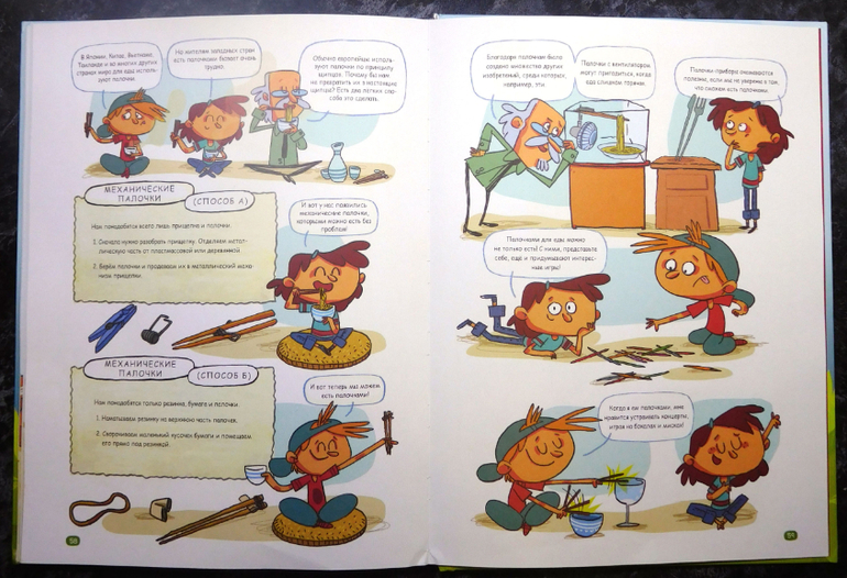 Первая глава занимает почти половину книги. В ней рассказывается о множестве изобретений - от скрепки и бумажных носовых платков до пейнтбола и планшета. Названия второй и третьей глав говорят сами за себя. А в четвертой главе авторы предлагают нам самим стать изобретателями. Моему ребенку особенно понравился "персональный кинотеатр" из картонной коробки и планшета - сын сразу его и сделал.