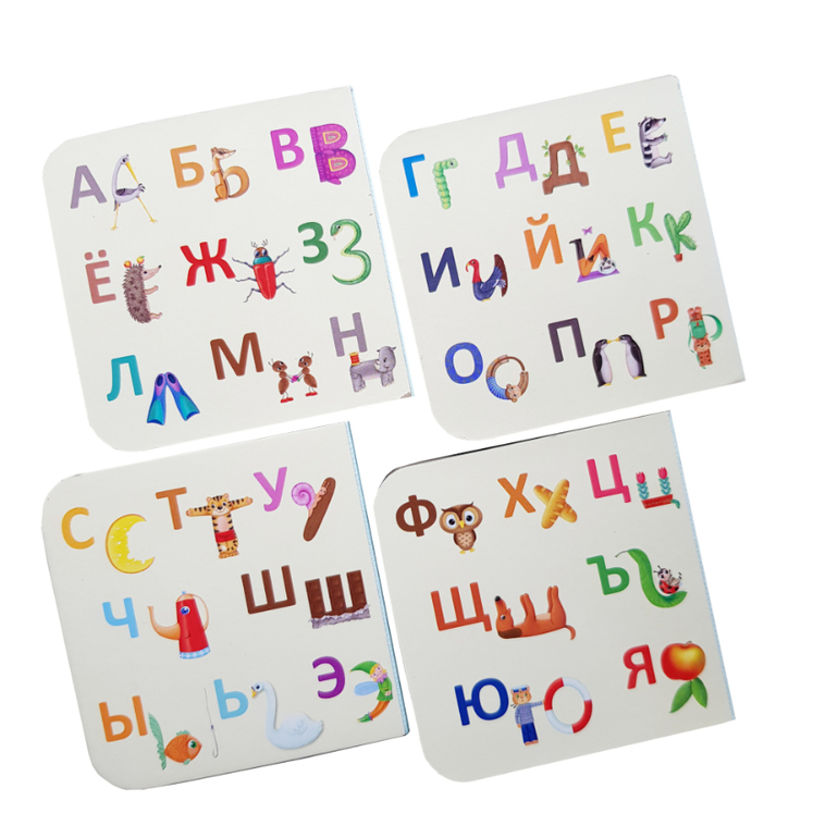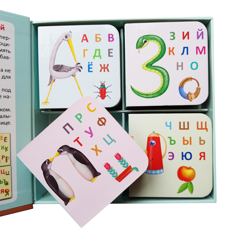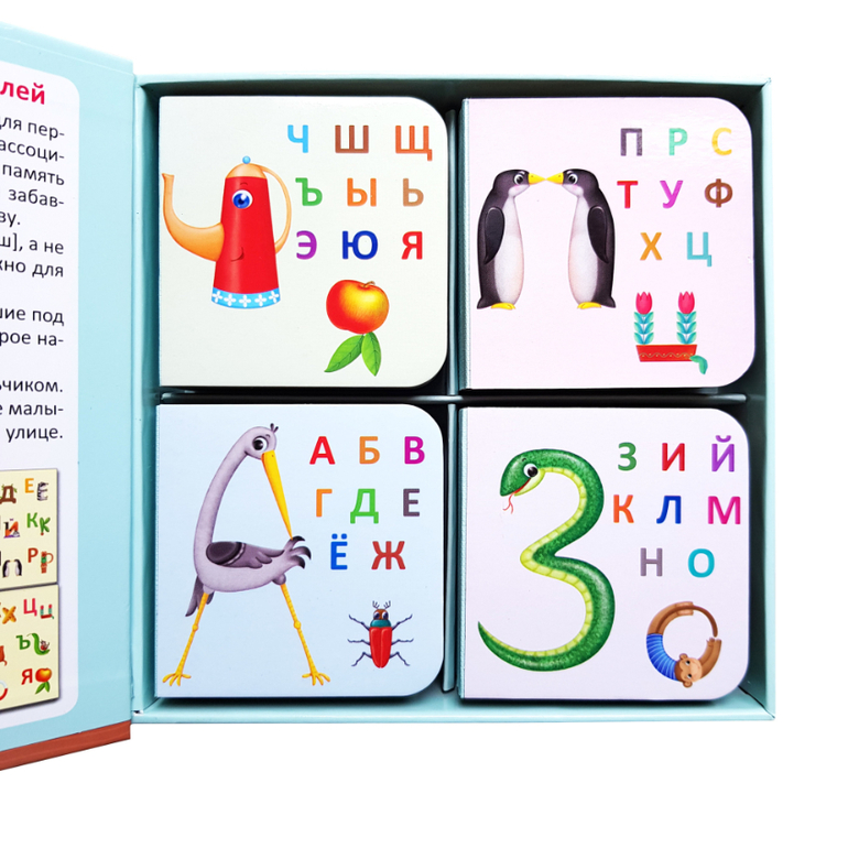 Внутри вы найдете 4 книжки-кубика с крупными буквами, забавной картинкой-ассоциацией, внешне напоминающей эту букву, а также весёлое двустишие Евгения Сосновского к соответствующей букве!