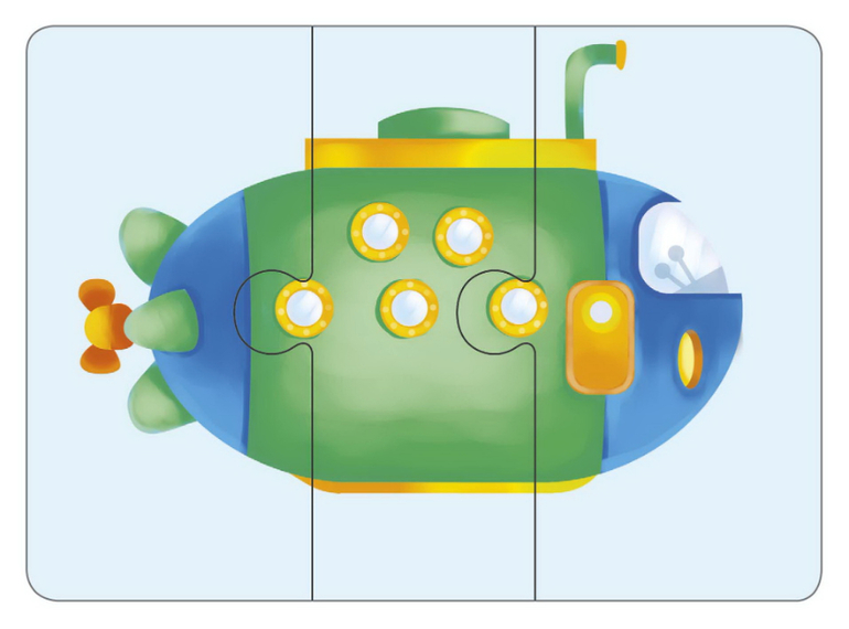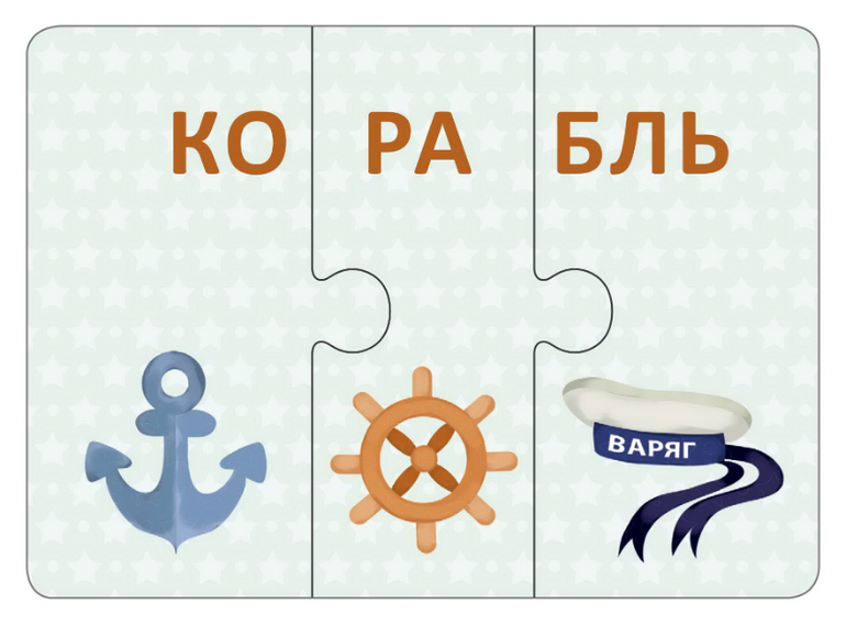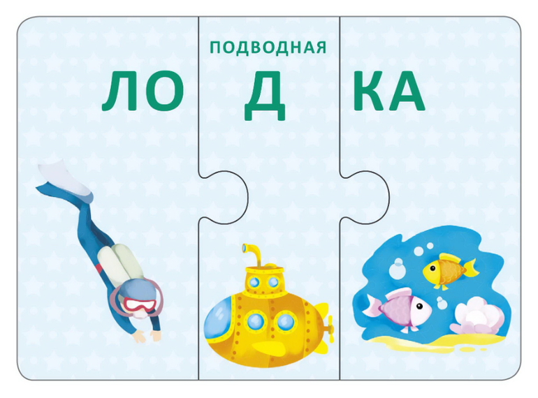 В наборе 33 карточки-пазла, из которых ребёнок сможет складывать картинки разной техники, состоящие из трёх букв или трёх слогов. В игре используется и лицевая, и оборотная сторона карточек. Проверить правильность собранного слова можно перевернув их. Если слово собрано верно, то с другой стороны будет правильно собранная картинка. На оборотной стороне картинки вы соберёте три изображения ассоциативно связанных друг с другом.