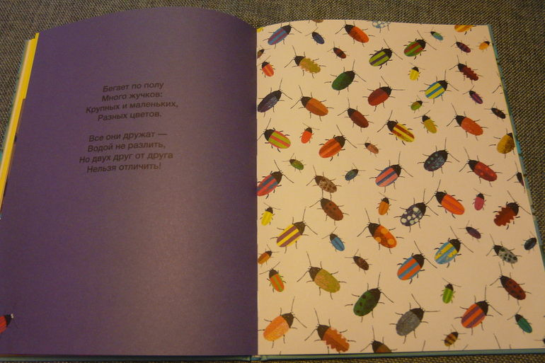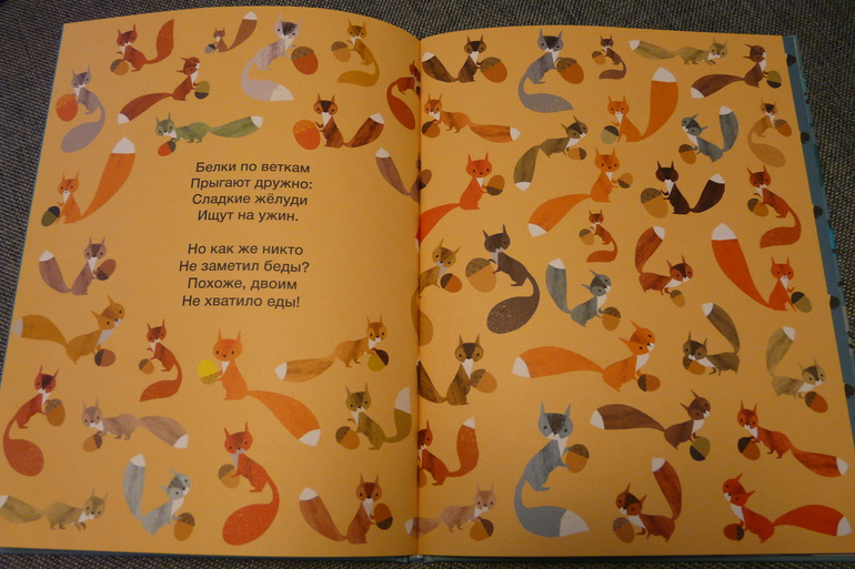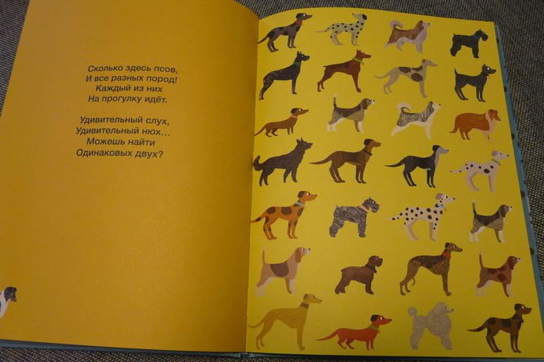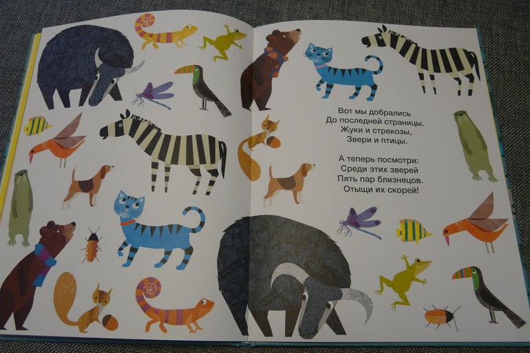 Итак,эта книга состоит из разворотов,на которых нужно найти различные пары: птиц,котиков,собак,медведей и т.д. Слева идет стихотворение ,справа картинка