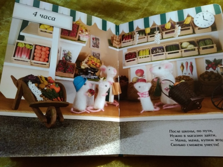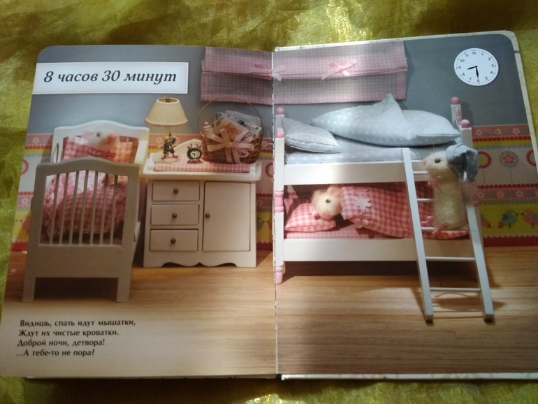Буквы на обложке выпуклые, страницы из тонкого гладкого картона с закругленными уголками. На каждом развороте фотоиллюстрация, четверостишие в переводе Марины Бородицкой и циферблат со стрелками, указывающими время. Открываешь книгу - и сразу без форзаца и лишних слов все понятно. Там сейчас звенит будильник, пищит мышонок - подъем! 7 часов!