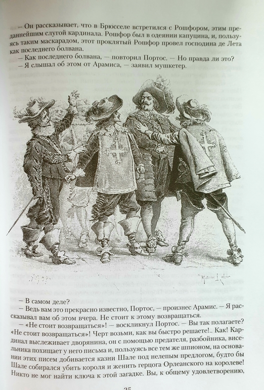 О сюжете писать не буду, наверное нет такого человека, который бы не знал о приключениях отважного гасконца. Поэтому о самой книге. Она достаточно увесиста (1 кг), отпечатана на тонкой офсетной бумаге. Думаю тонкость определена весом, иначе книга стала бы еще тяжелее. Но не могу сказать, что она слишком тонка. Белая, не просвечивает. Форзац украшают так же рисунки Лелуара