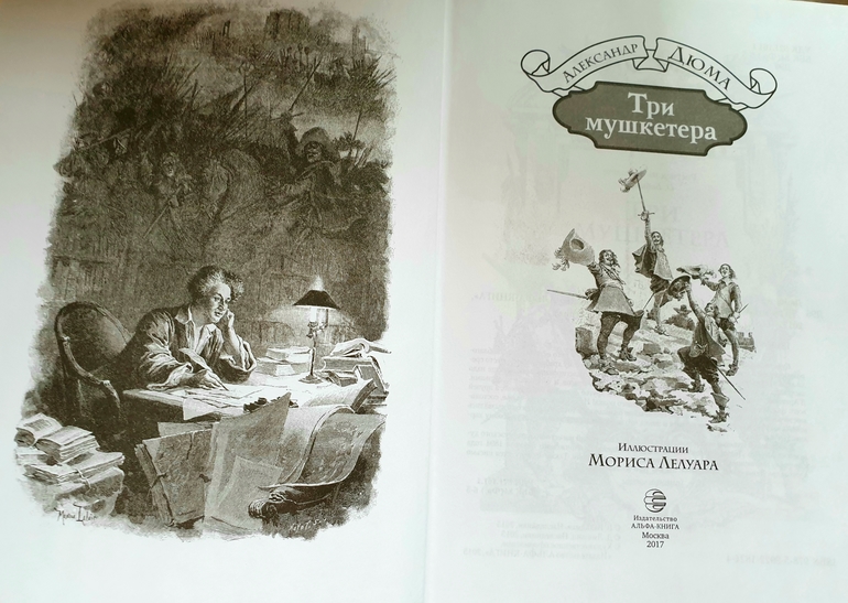 В далеком 1894 году, в Париже было выпущено юбилейное издание "Три мушкетера", именно данная книга максимально схожа с тем вариантом. В ней представлены все 250 иллюстраций Мориса Лелуара, использован классический перевод, даже формат приблизительно тот же.
