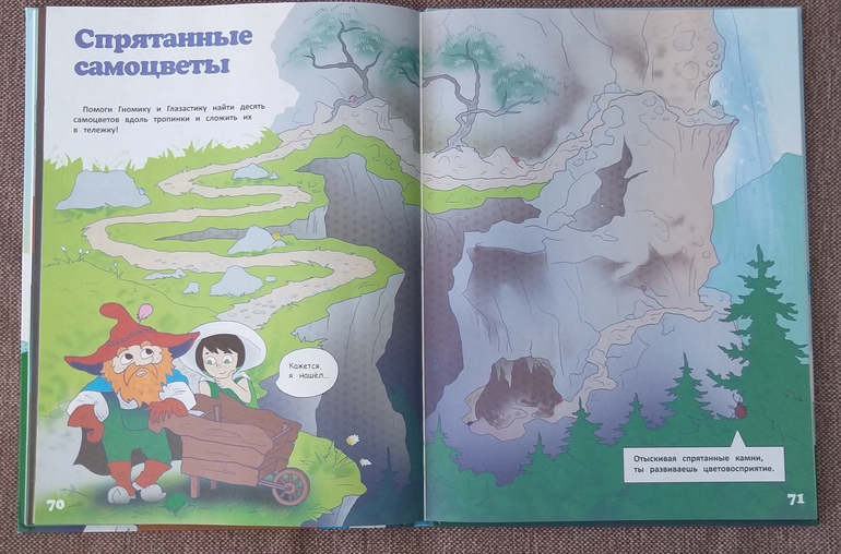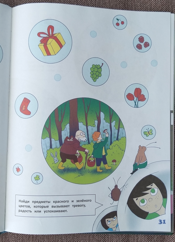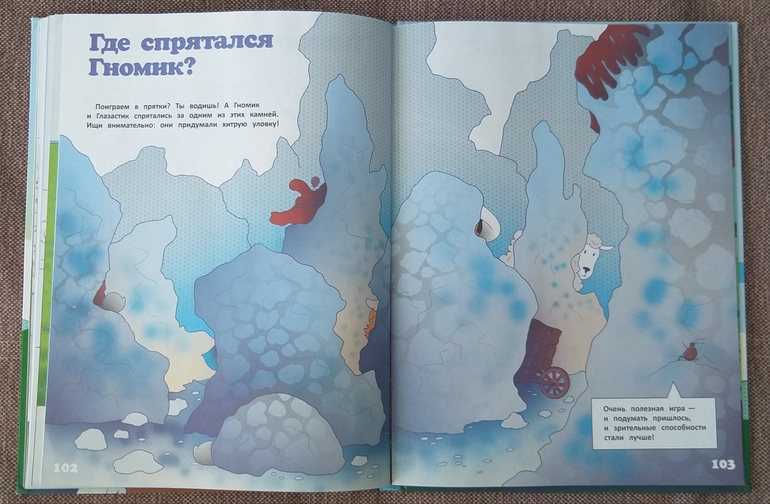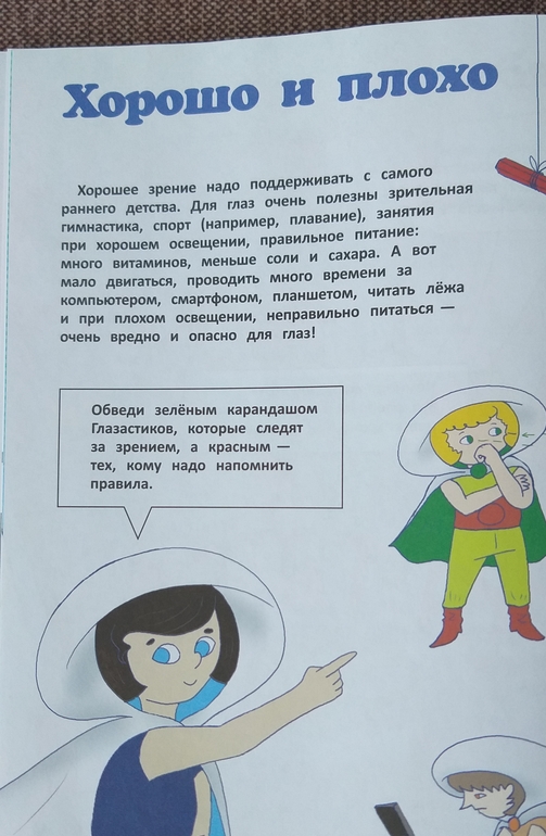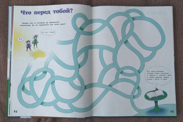 2. Полезный объем книжки составляет 113 страниц. Из них информация о глазах занимает 20 страниц, 2 страницы посвящены гимнастике для глаз, 4 - опытам, связанным со зрением, сказка с авторской методикой (о ней ниже) 24 страницы, а остальное - около 60 страниц - это лабиринты, задания "найди и покажи", задания раскрасить и дорисовать и прочее. Причем задания автор хоть и пытается притянуть за уши к некой пользе для глаз, но на деле это самые простые, не самые красивые, не самые атмосферные задачки для дошкольников.