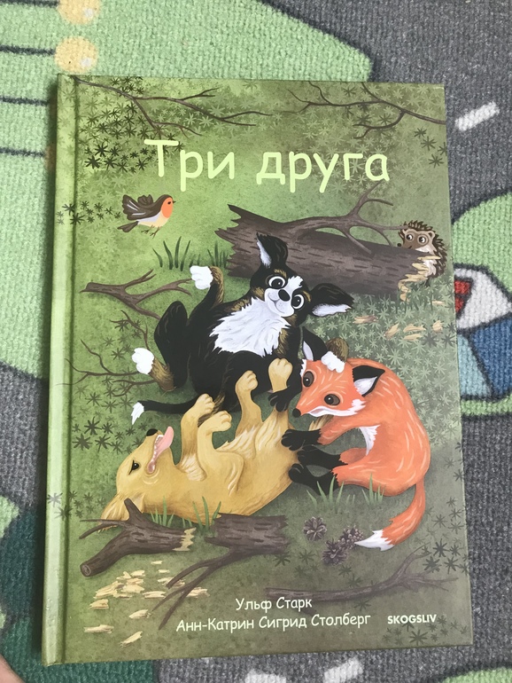 И еще одна книга попала к нам случайно.В икее была скидка на нее и сын уговорил взять. Я читала и растраивалась.Сказка о щенках которым сказали сидеть дома,они убежали и встретели лисенка(который так же сбежал).В итоге родители их нашли и они помирились. Родители собаки и лиса тоже подружились и обещали жить мирно.