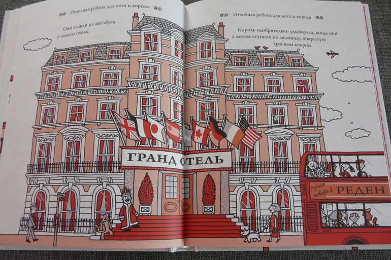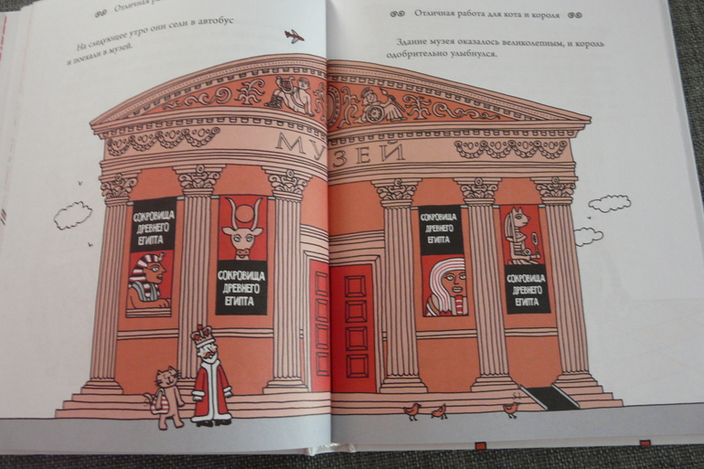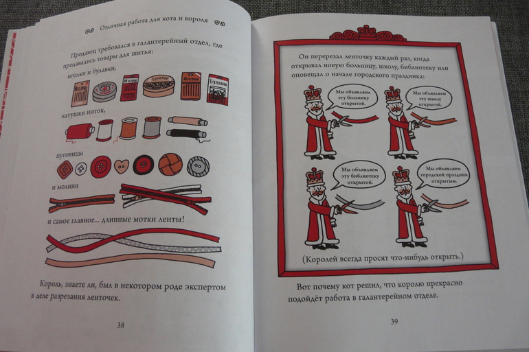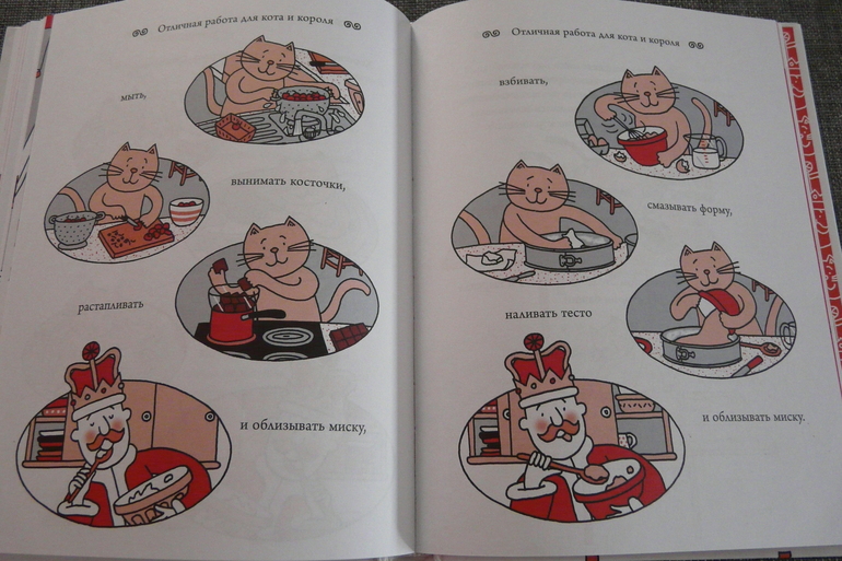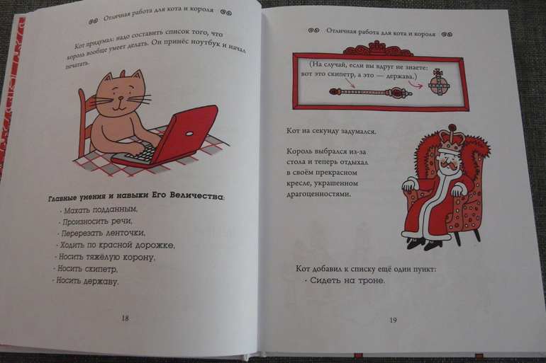 Так как ничего подходящего для короля не нашлось.Кот решил составить список того ,что умеет делать Король.Мне очень нравится ,что в книге акцентируют внимание на некоторых вещах,которые не так легко запомнить,например что такое скипетр и держава :) Можно поговорить с ребенком о том,что умеет делать он.Даже составить список ,как у короля и подумать,где бы он смог работать:)