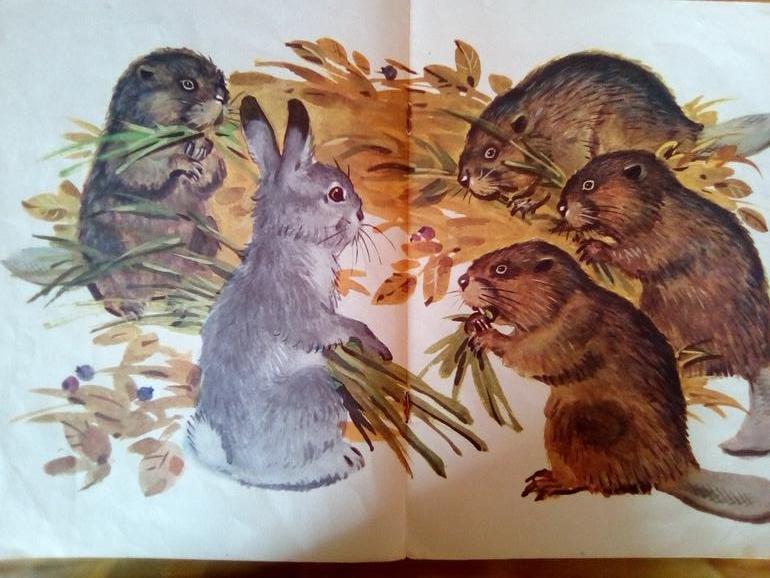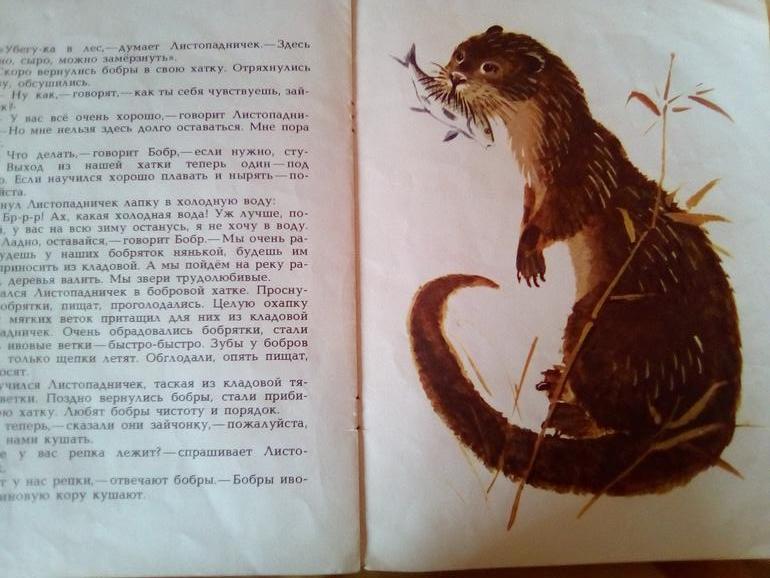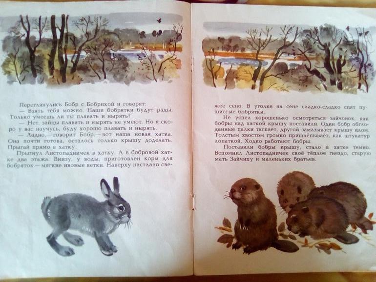 А название следующей книжки само говорит об осени. И. Соколов-Микитов "Листопадничек". У нас старенькая букинистика, даже без обложки, но, кажется, я видела, что уже и переиздали её. Это замечательная книжка с красивыми иллюстрациями Я. Манухина, на которых прекрасно изображена осенняя природа. Сказка о том, как зайчонок пытался пожить жизнью бобров, но в итоге понял, что своя, заячья, жизнь для него намного милее!