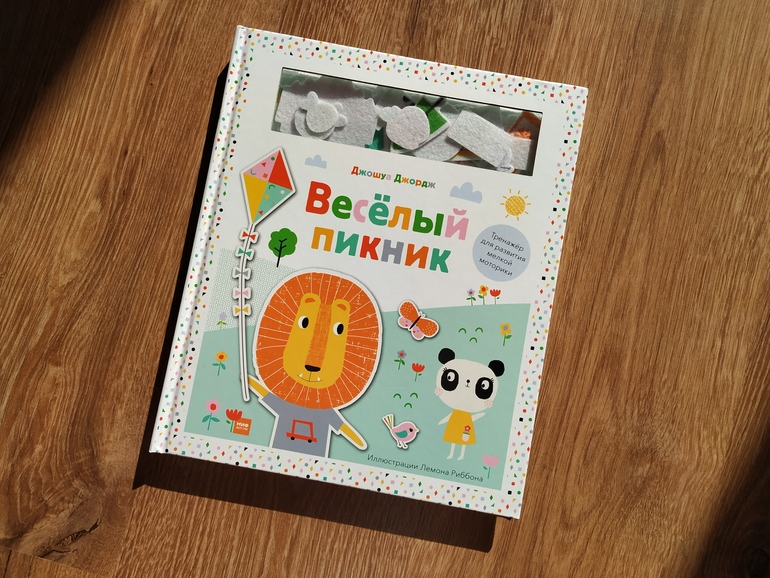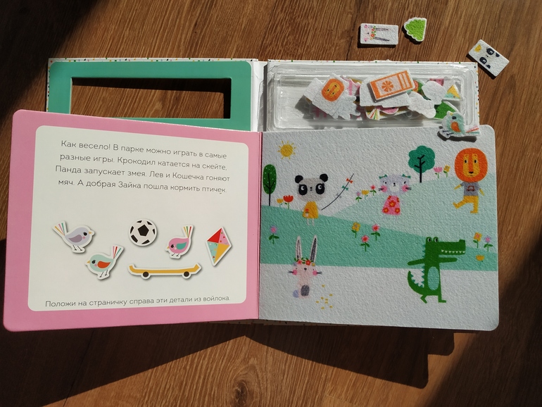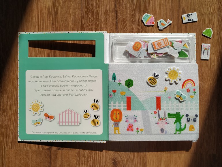В книге 5 разворотов, объединенных темой "пикник". На каждом развороте есть пояснительный текст и задания. А можно и без заданий самим придумывать сюжет игры.