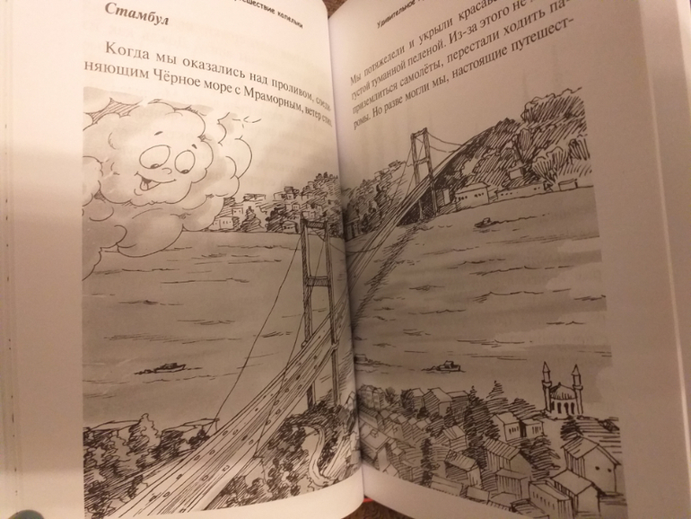 Меня заинтриговал вопрос автора, который она задала ученикам на уроке и который приводится в предисловии: "Можем ли мы из источника на горе Паландокен попить воды из Амазонки?" Я ожидала, что вот сейчас-то мне нарисуют все маршруты, входы и выходы, да еще в мировом масштабе! Но путешествие конкретного героя сводилось к Атлантическому океану, берегам Африки и проливу Босфор, турецкому курорту, турецким подземным пещерам, турецким деревням на берегах. В общем, понятно, что автор старалась подробнее остановиться на родной земле)) Это конечно, хорошо - в тексте говорится немного о культуре, о традициях Турции, но мне хотелось бОльшего масштаба)