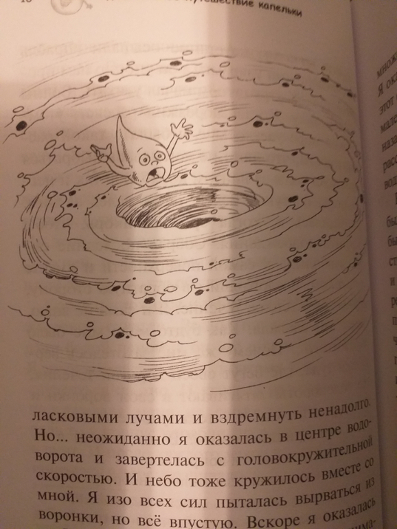 Капелька начинает путешествие наивным неопытным малышом, который старается разобраться в окружающем мире и я вместе с ней планировала узнать, как же возникают гром и молнии? Однако в тексте написано лишь (капелька в составе тучи): "А туча все росла и становилась темнее...От трения с земной поверхностью в нам накапливалось электричество...огненные всполохи появляются всего лишь из-за того, что тучи трутся о воздух и землю и наэлекризовываются. Сейчас даже в моем маленьком теле скопилось бесчисленное множество электронов. И мне уже не терпится поскорее от них освободиться." Все. Я ждала более понятной информации. Но несмотря на такую неосведомленность в окружающем мире и желание все понять и объяснить, главная героиня упоминает и водовороты, и сталактиты, и работу воды для производства электричества как само собой разумеющееся и не требующее пояснений. А жаль...