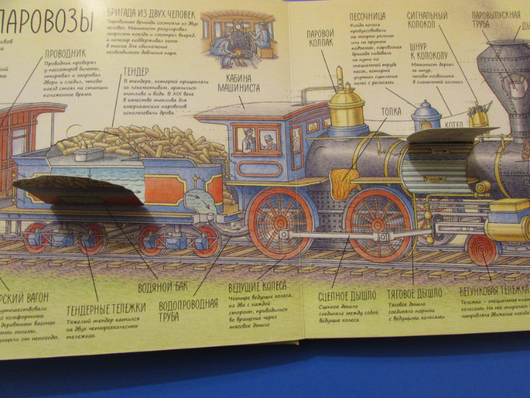 На каждом развороте книги дается подробное описание поездов/паровозов.