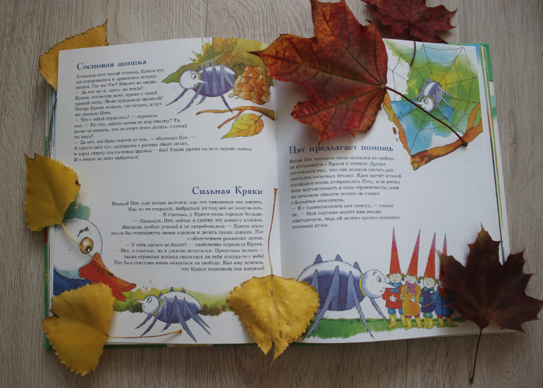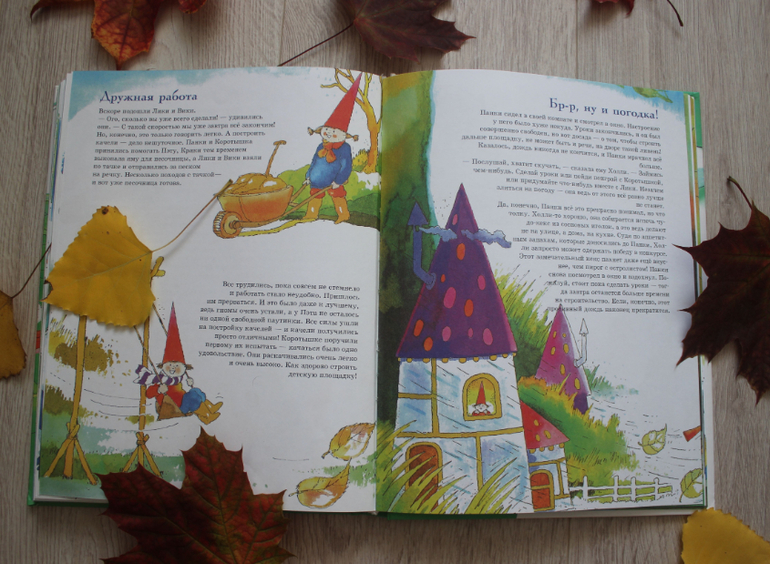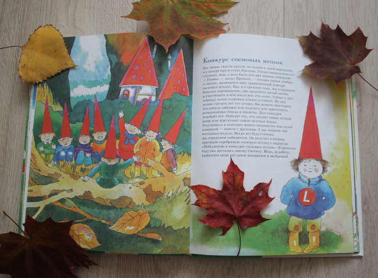 Следующая книга, про которую хочу рассказать: "301 история о веселых гномах" Элин Херман. Повествование разбито на небольшие части, которые связаны между собой по смыслу. Эту книгу я купила совершенно случайно в фикс-прайсе. Мы взяли ее с собой в долгую дорогу для чтения ребенку, и неожиданно она превзошла мои ожидания. Истории о гномах добрые, интересные, рисунки приятные. Дочке очень понравилась сказка, уже несколько раз ее перечитывали. Часть историй происходит осенью.