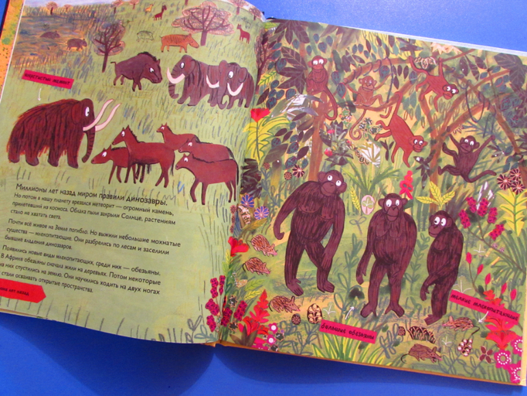 Появились новые виды млекопитающих, среди них - обезьяны. В Африке обезьяны сначала жили на деревьях. Потом некоторые из них спустились на землю. Они научились ходить на двух ногах и стали осваивать открытые пространства.