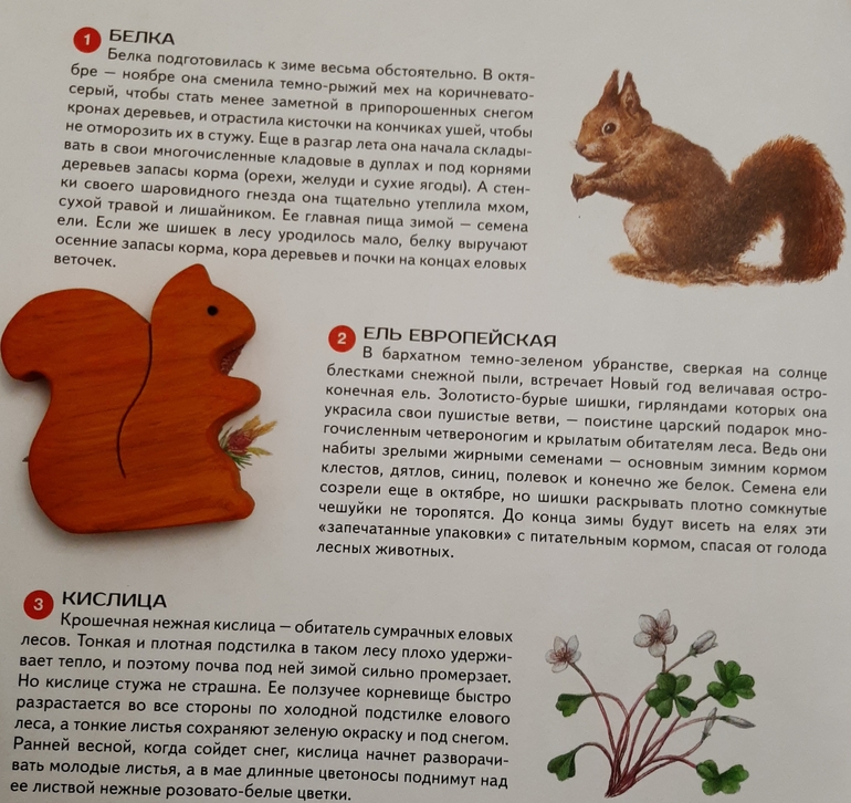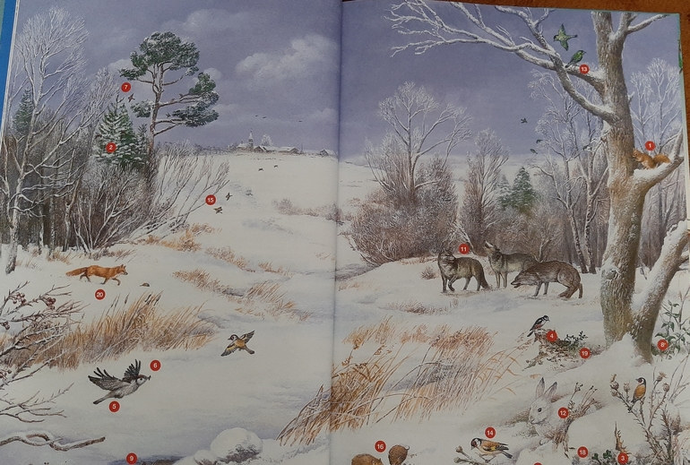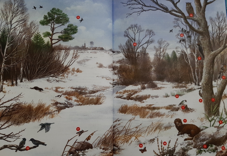 Помимо описания природы, рассказывается о том, как животные переживают этот сезон, как готовятся к последующим изменениях. На рисунках интересные объекты отмечаны числами, и дальше про них идет более подробная информация