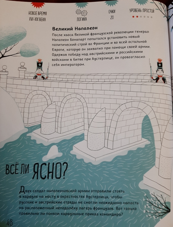 Задания двух видов, на логику и на воображение, с разным уровнем сложности. Каждая задачка начинается небольшим экскурсом в историю, есть совсем легкие, мы даже с Полинкой недоумевали, и что, всё??)
