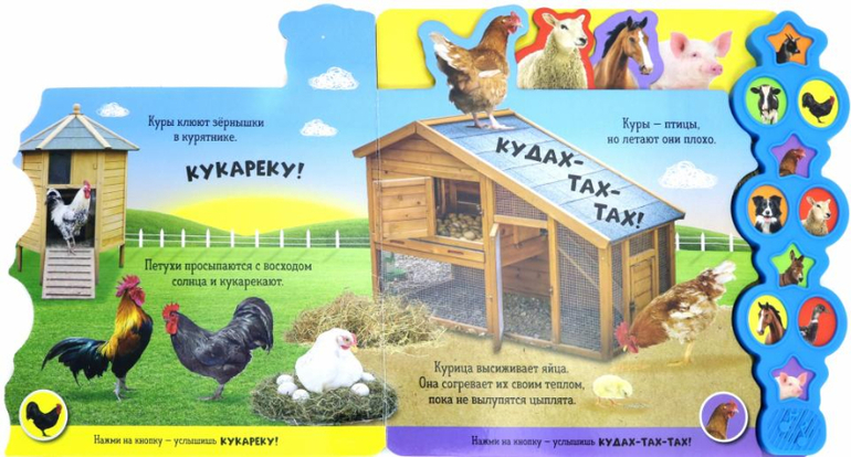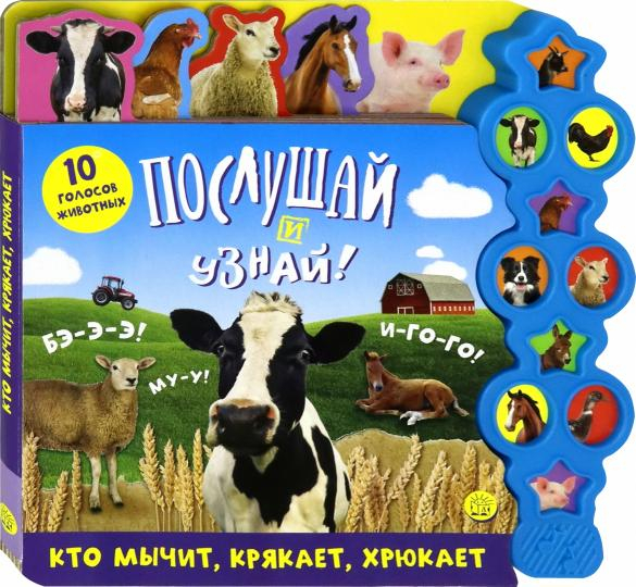 Большие картонные книги серии познакомят маленького ребёнка с дикими животными и их детёнышами, с обитателями фермы и разнообразными машинами! На страницах собраны короткие интересные факты, а у каждого животного и машины в книжке есть настоящий голос! Нужно только нажать на соответствующую картинку на звуковом модуле, чтобы телёнок замычал, овечка заблеяла, зарычал грузовик и загудел самолёт. Каждая книжка может издавать целых 10 разных звуков!