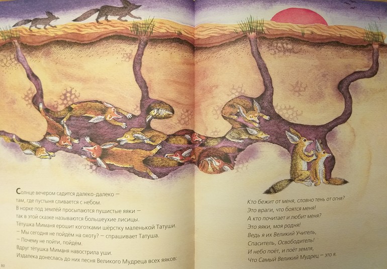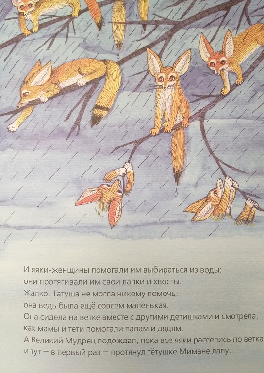Великий Мудрец чаще портачил по мелочам. Но однажды ошибся крупно. Не послушал мудрую тетушку Миманю и выбрал неправильное место для норы, которую затопило при первом же ливне. Пришлось яякам ночью выбираться наружу. Промокшие, напуганные, сидели они на дереве, тут Великий впервые показал себя мудрецом: