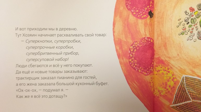 Во-вторых, язык. Я не знаю, как было в оригинале, но перевод замечательный. Одни только «суперкнопки, суперпробки» чего стоят! Отличные диалоги, в которых свинья хрюкает, петух кукарекает, а курочка кудахчет. Устаю я от «он сказал - она сказала». Окончательно же меня покорили «влазилки-вылазилки», «прыжочки-на-лужочке» и «Хоппельпоп!» - он теперь в моем активном словаре.