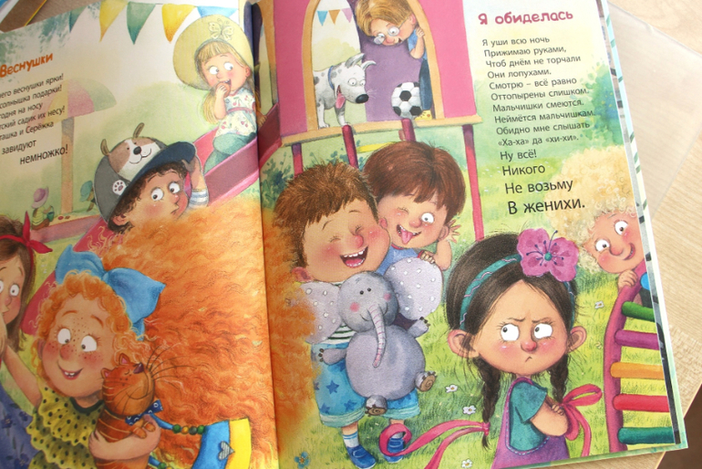Иллюстрации мальчишкам очень понравились. Меня немного смутили пучеглазые дети, но у них у всех так хорошо прорисованы характер и настроение, что рассматриваешь, как книгу читаешь. Эмоции считываются и у животных, и даже у игрушек. Дети мои хохочут над каждой страницей.