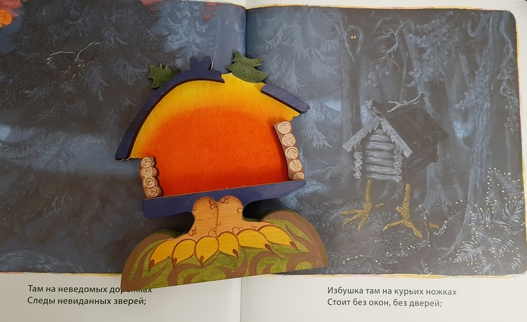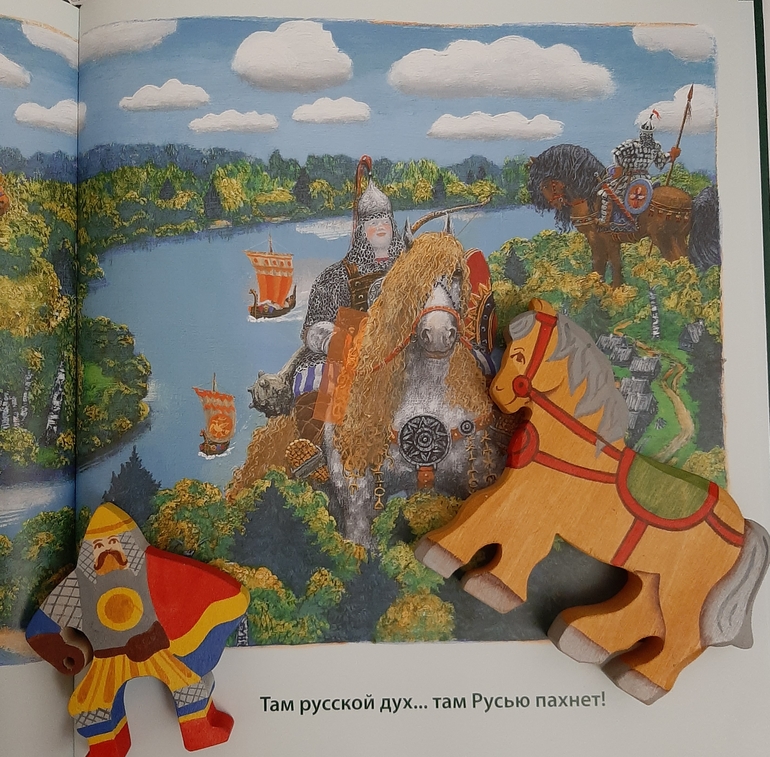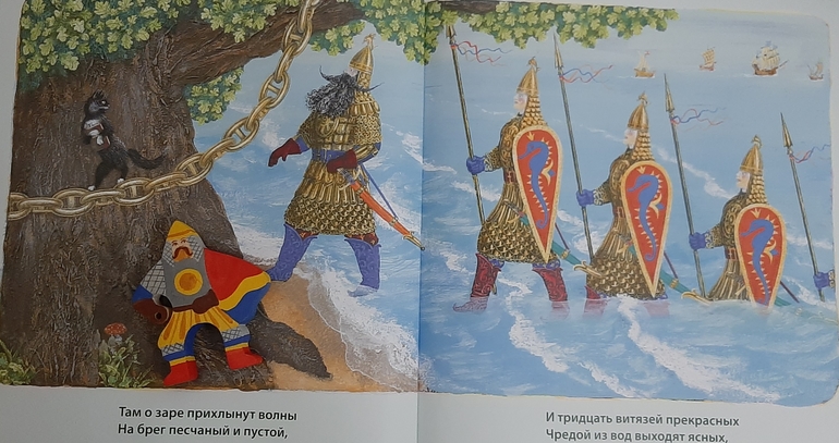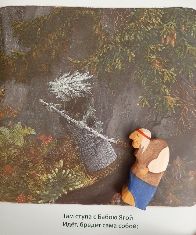 Каждый разворот внимательно изучал, рассматривал, кучу вопросов задавал, кто такой леший, куда колдун богатыря несет, кто там в дупле