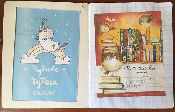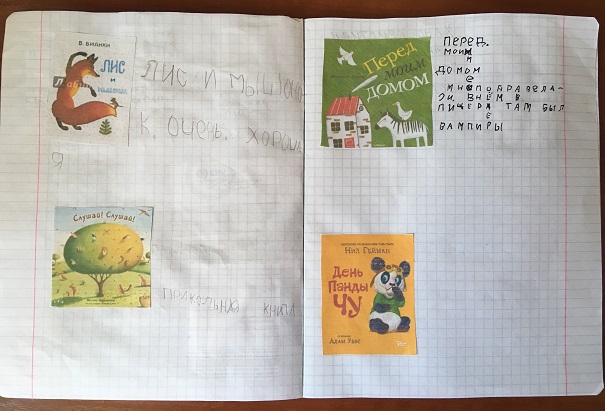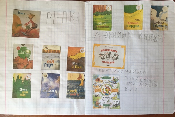 Ну и напоследок хотела показать а-ля дневник чтения младшей.) Она любит клеить фото самостоятельно прочитанных книг и даже пытается немного что-нибудь написать.)